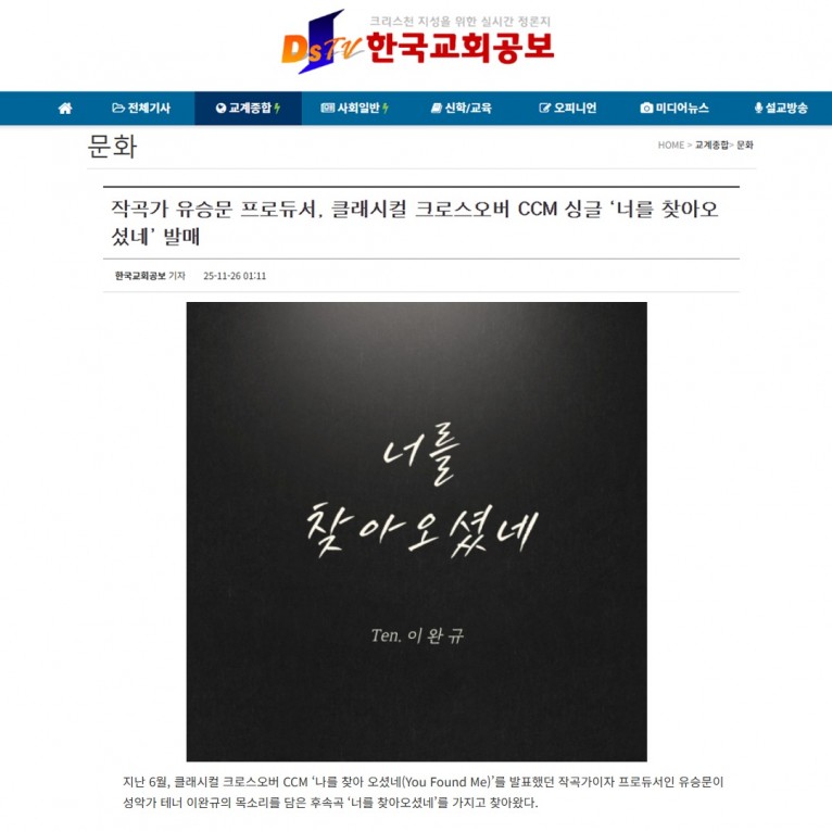 [기사] 작곡가 유승문 프로듀서, 클래시컬 크로스오버 CCM 싱글 ‘너를 찾아오셨네’ 발매(한국교회공보)